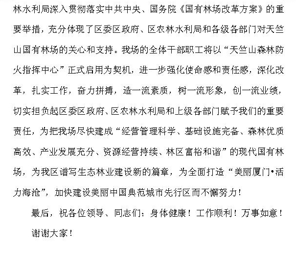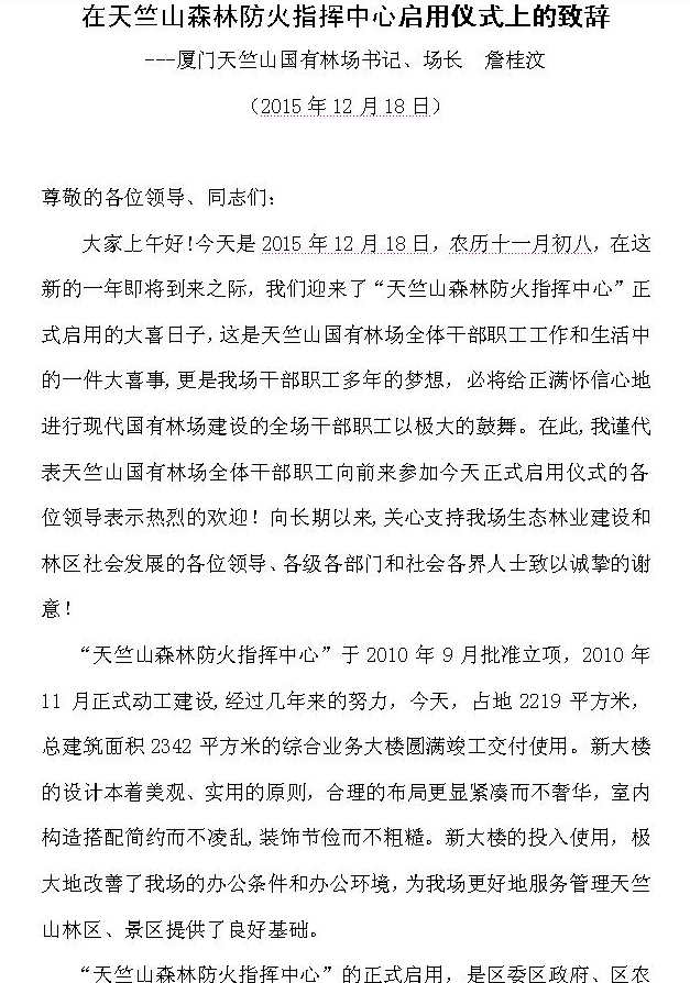 在天竺山森林防火指挥中心启用仪式上的致辞